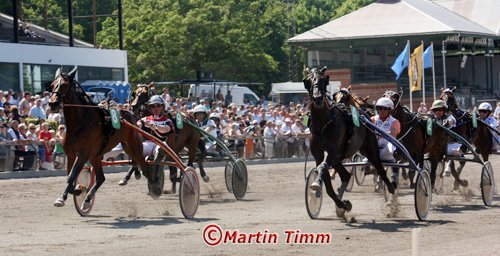 July 5 - If there had been any doubt remaining after her all age Danish National Record at Charlottenlund, Swept To Victory proved today that she belongs with the highest elite of European mare trotters today when she established an all-age mare Track Record at Halmstad (SE) in the $42,000 Elite Mare trotting event. Starting from Post 2, Swept To Victory sat the deep along the rail for most of the race as the top mare Camilla Highness set the pace. At the top of the stretch, Swept To Victory finally managed to get clear and rallied from far behind Camilla Highness to storm up for the win at the wire in 1:55f. This new track record demolished the old Track Record of 1:56.1f.