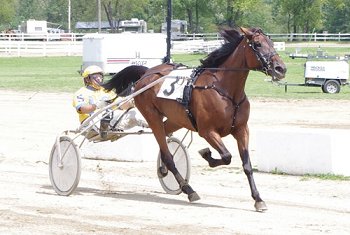 July 23 - Chandelle (Majestic Son - Aeronautess) swooped over the competition to win her first Stakes race, a $25,200 ONTSS-GR for two year old trotting fillies at Kawartha Downs tonight. Starting from Post 5, Chandelle quickly established a lead for driver Warren Hie. Chandelle remained in command until the top of the stretch where she was briefly challenged, but then pulled away for a comfortable one length victory in 2:03.3f. Owned by Roger Hie, Hielite Acres, and Fabulous Farms of NJ, Chandelle will compete in more ONTSS-GR events in the near future.